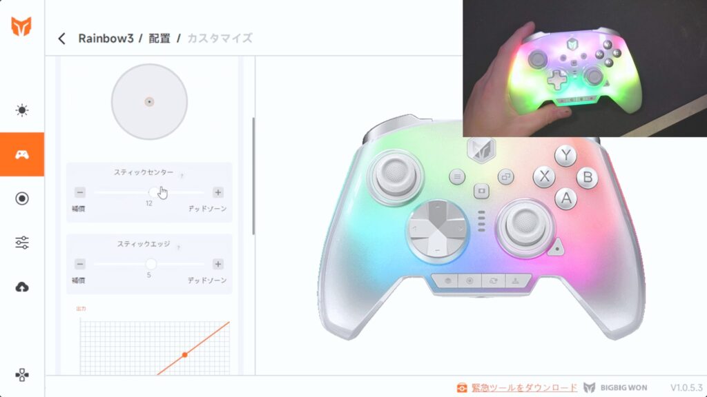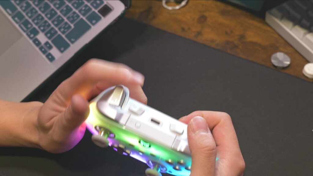 あとは、スティックに関して。ワイルズだとカメラ操作もだけど集中モードでFPSのエイムみたいなこともするから、結構スティックって大事なんですよ。ゲーム内設定にデッドゾーンの設定もあるくらいだしね。んで、Rainbow3は非常に良い。静電容量式はもちろん初めてなんだけど、違和感はなくてむしろしっくりくる。倒した時の反応も急に立ち上がることは無くて、リニアに近いように感じます。ここら辺は設定で追い込めるけど、初期状態で違和感ないのはかなりGOODですね。
