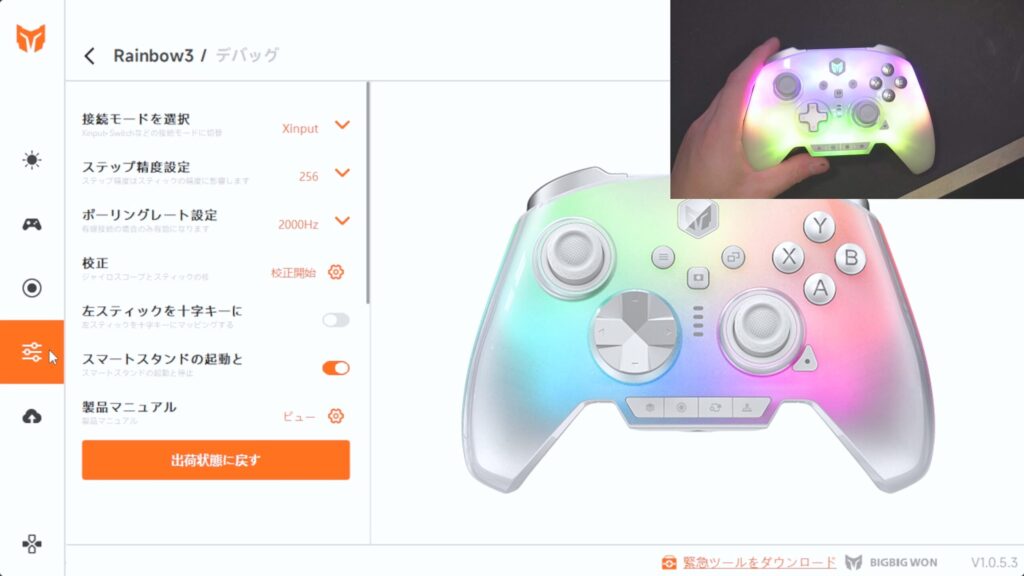 ここでは接続モードの変更、ステップ精度変更、ポーリングレートの変更、この3つを主に変えるかな?ステップ精度以外は本体のみでも設定できます。ステップ精度はスティックの入力を何段階で検知するかというものみたい。本来は256よりももっと細かくできるみたいだけど、結局ゲーム内での処理で256近辺に制限されるからあえてこの数値にしてるっぽい?ここはそれぞれの好みで設定しましょう。