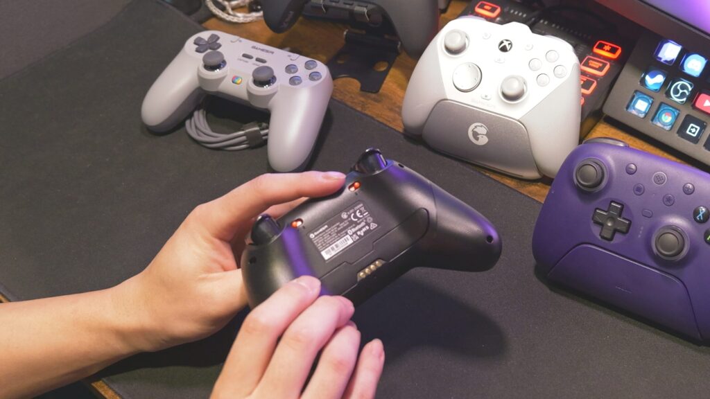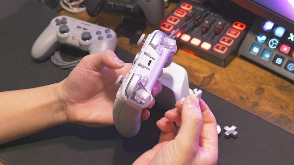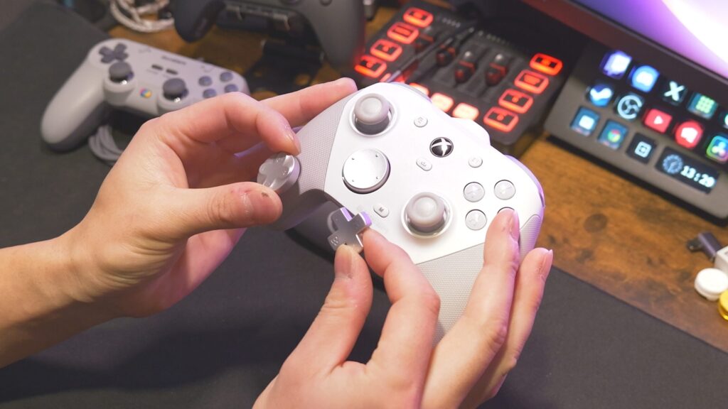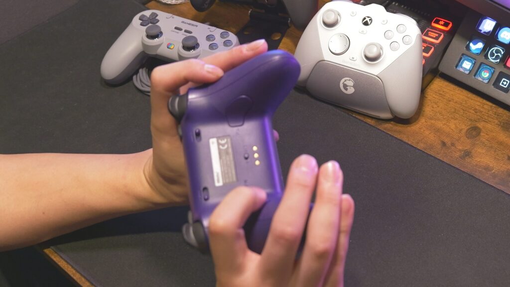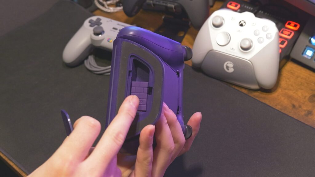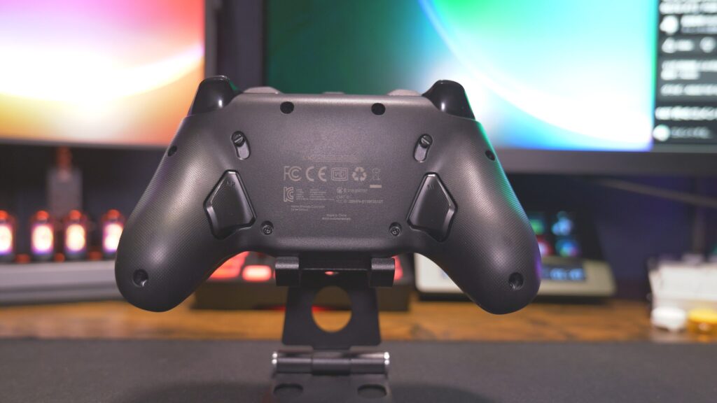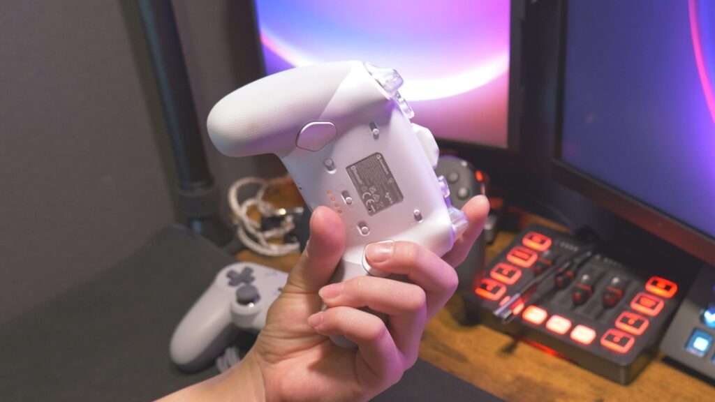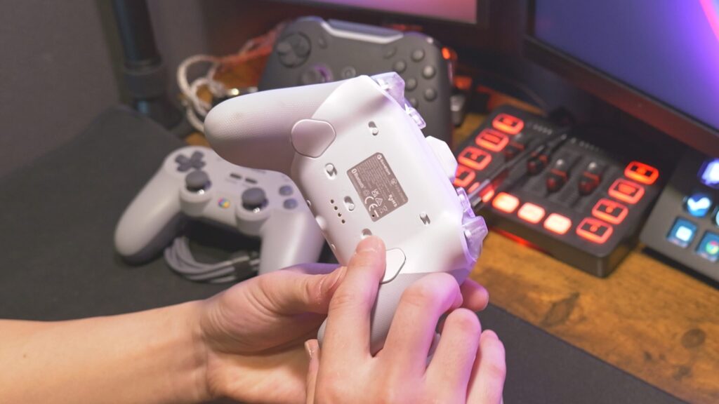 機能的には、背面とバンパーに追加ボタンを搭載、トリガーストップもあり、充電ドックも付属してきます。基本的な操作ボタンはマイクロスイッチで非常に操作感が良い。やっぱり小気味よく動作するスイッチって良いんだよね。背面の追加ボタンとRB/LBはタクタイルスイッチなんだけど、トリガーストップONするとこっちはマイクロスイッチだし、バンパーの追加ボタンもマイクロスイッチ。できれば全部マイクロスイッチが良かったとは思っちゃう。