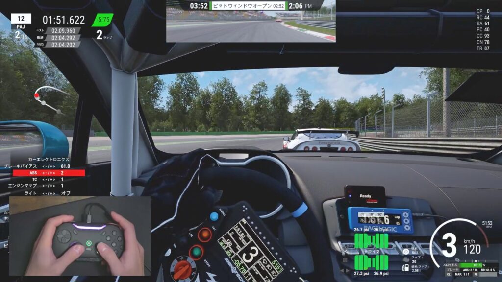 はい、レースゲーはアセットコルサ。ここでも問題なく十分な使い心地。アクセルとブレーキをトリガーで操作するんで、トリガーの使用感。トリガーはソフトウェアで設定せず初期状態で使ってます。それでも快適に操作できるんだよね。レース中の相手に合わせる調整もできるし、アクセルを踏み込む加速でも微調整はしっかりできます。