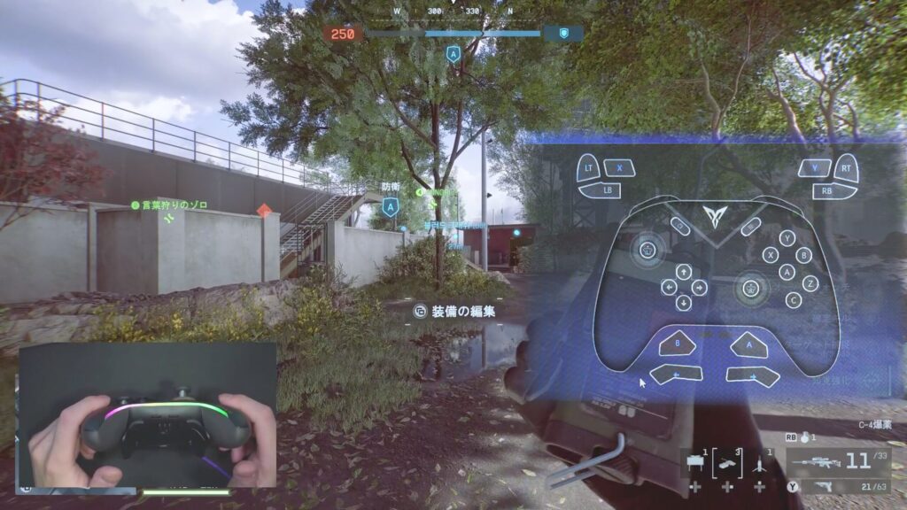 なので…とりあえず左スティックを苦し紛れに割り当てました。これを割り当てれば、スリンガーに閃光弾を装填していれば武器を構えていても閃光弾を打ち出せます。これで武器を毎回収納してから打ち出す必要がなくなるのでオススメ。でも武器の同時押しコマンド設定したかったなぁ。
