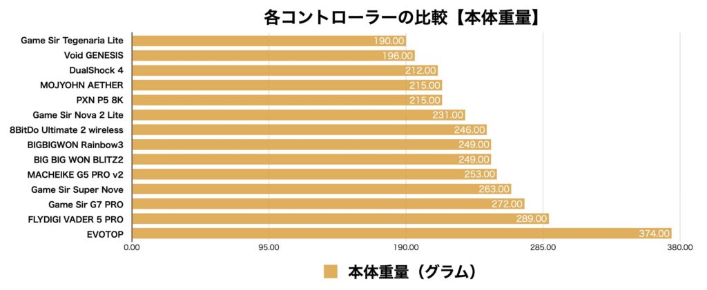 僕の持ってるコントローラーと一覧で比較。結構重い部類のコントローラーなのが分かりますね。実際に使ってみてから、必要なら振動除去もしてみようかな?